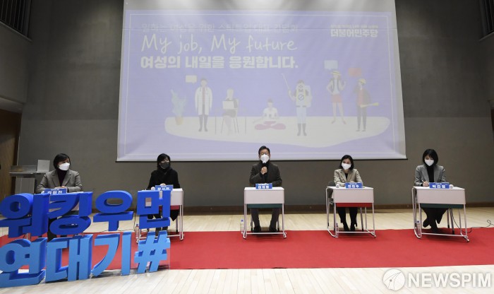 [서울=뉴스핌] 국회사진취재단 = 이재명 더불어민주당 대통령 후보는 10일 동작구 대방동 페이스살림에서 열린 일하는 여성을 위한 스타트업 대표 간담회에서 인사말을 하고 있다. 2022.01.10 photo@newspim.com