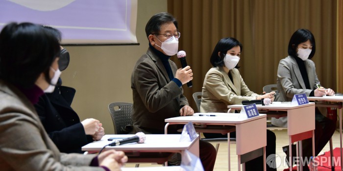 [서울=뉴스핌] 국회사진취재단 = 이재명 더불어민주당 대선후보가 10일 동작구 대방동 페이스살림에서 열린 ‘일하는 여성을 위한 스타트업 대표 간담회’에 참석해 발언을 하고 있다. 2022.01.10 photo@newspim.com