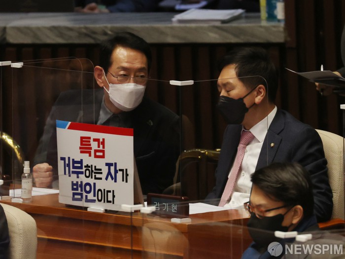 [서울=뉴스핌] 이형석 기자 = 김기현 국민의힘 원내대표와 김도읍 정책위의장이 11일 오후 서울 여의도 국회에서 열린 새해 첫 본회의에 참석해 대화하고 있다. 2022.01.11 leehs@newspim.com