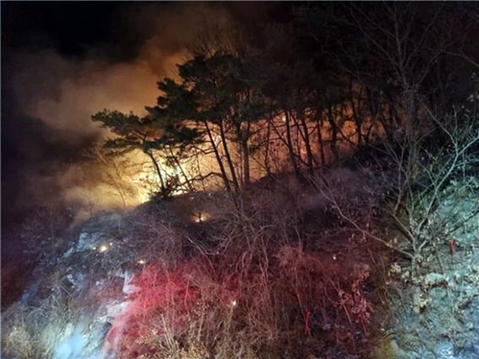 [안동=뉴스핌] 남효선 기자 = 경북 안동시 일직면 원호리 한 야산에서 12일 오후 8시47분쯤 원인을 알 수 없는 산불이 발생해 산림당국이 진화를 서두르고 있다.