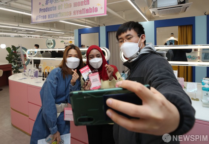 [서울=뉴스핌] 김민지 기자 = 2022 코리아그랜드세일 개막날인 13일 오후 서울 중구 뷰티 플레이에서 열린 케이-뷰티쇼에서 외국인 관광객들이 한국 미용 체험을 하고 있다. 코리아그랜드세일은 관광 비수기인 겨울철 외국인 관광객 방문을 촉진하기 위해 2011년부터 개최해 온 쇼핑문화관광축제로, 내달 28일까지 열린다. 2022.01.13 kimkim@newspim.com