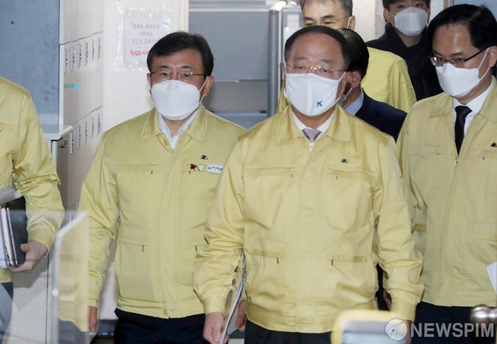 [서울=뉴스핌] 정일구 기자 = 홍남기 부총리 겸 기획재정부 장관(왼쪽부터)과 권덕철 보건복지부 장관, 강성천 중소벤처기업부 차관이 14일 오전 서울 종로구 정부서울청사에서 열린 방역조치 연장 및 소상공인 지원관련 정부합동 브리핑에 참석하고 있다. 2022.01.14 mironj19@newspim.com