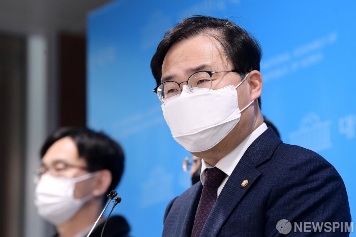 [서울=뉴스핌] 이형석 기자 = 홍석준 국민의힘 의원이 17일 오후 서울 여의도 국회 소통관에서 코로나19 확산으로 인한 정부의 방역지침과 관련 '방역패스 집행정지' 소송대리인단과 함께 기자회견을 열고 발언하고 있다. 2022.01.17 leehs@newspim.com
