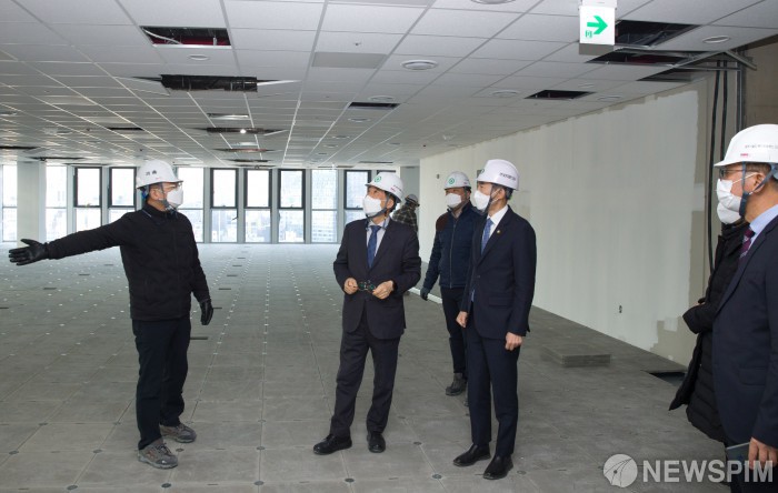[서울=뉴스핌] 용홍택 과학기술정보통신부 제1차관이 18일 오전 서울 강남구 한국과학기술회관에 위치한 한국과학기술단체총연합회를 방문해 문해주 한국과학기술단체총연합회 사무총장 등과 '과학기술인 복지콤플렉스 건립' 안전관리 점검을 하고 있다.[사진= 과학기술정보통신부 ] 2022.01.18 photo@newspim.com