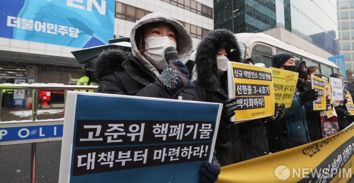 [서울=뉴스핌] 최상수 기자 = 2022 탈핵대선연대가 19일 서울 여의도 더불어민주당사 앞에서 기자회견을 열고 신규 핵발전소 건설 반대 및 신한울 3·4호기 백지화를 촉구하고 있다. 2022.01.19 kilroy023@newspim.com