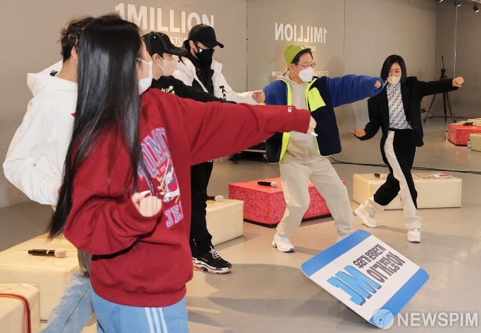 [서울=뉴스핌] 국회사진취재단 = 이재명 더불어민주당 후보가 20일 서울 성동구 원밀리언 댄스 스튜디오에서 열린 ‘JM, 우리가 원하던게 이거잖아’간담회에서 리아킴, 백구영, 영제이, 시미즈, 하리무, 루트 등 댄서들에게 춤동작을 배우고 있다. 2022.01.20 photo@newspim.com