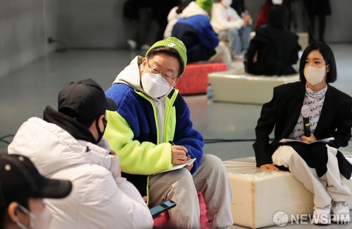 [서울=뉴스핌] 국회사진취재단 = 이재명 더불어민주당 후보가 20일 서울 성동구 원밀리언 댄스 스튜디오에서 열린 ‘JM, 우리가 원하던게 이거잖아’간담회에서 질문을 듣고 있다. 2022.01.20 photo@newspim.com
