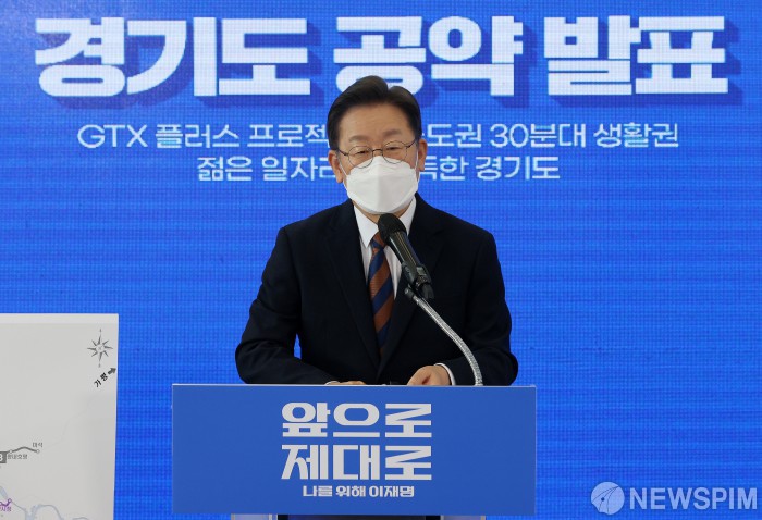 [용인=뉴스핌] 국회사진취재단 = 이재명 더불어민주당 대선 후보가 24일 오전 경기 용인 포은아트홀에서 경기도 정책 공약 발표를 하고 있다. 2022.01.24 photo@newspim.com