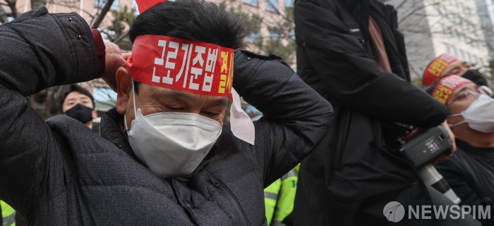 [서울=뉴스핌] 최상수 기자 = 코로나피해자영업총연합(코자총) 소속 자영업자가 25일 서울 여의도 국회 인근에서 열린 '분노의 299인 릴레이 삭발식'에서 머리끈을 매고 있다. 2022.01.25 kilroy023@newspim.com