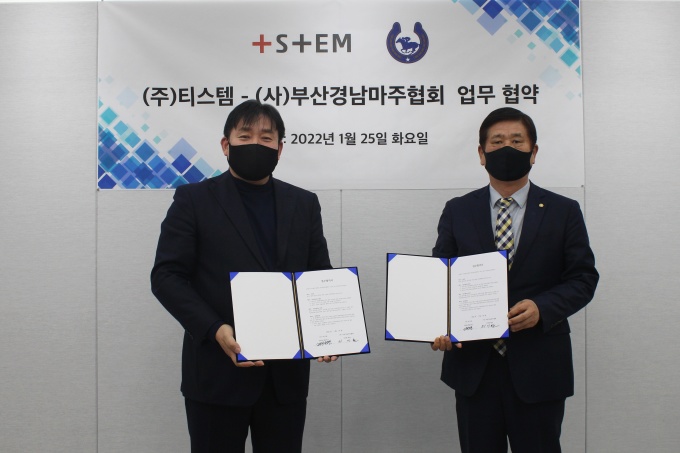 | 김영실 ㈜티스템 대표이사(왼쪽)와 이시환 사단법인 부산경남마주협회장이 말 복지 및 삶의 질 향상을 위한 업무협약(MOU)을 체결하고 기념사진을 찍고 있다.[사진=㈜티스템] 2022.01.26 news2349@newspim.com |