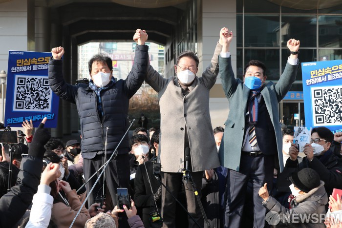 [파주=뉴스핌] 국회사진취재단 = 이재명 더불어민주당 대선후보(가운데)가 26일 오후 경기도 파주시 금촌역 광장에서 열린 거리연설에서 윤후덕 의원(왼쪽), 박정 의원과 손을 들어 시민들에게 인사하고 있다. 2022.01.26 photo@newspim.com