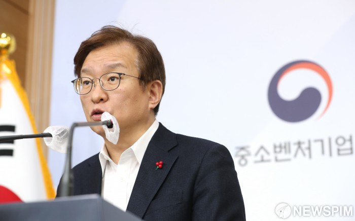 [서울=뉴스핌] 김학선 기자 = 권칠승 중소벤처기업부 장관이 27일 서울 종로구 정부서울청사 별관 브리핑실에서 21년 벤처투자 실적 발표를 하고 있다. 2022.01.27 yooksa@newspim.com