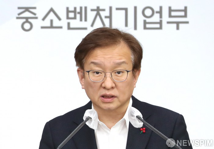[서울=뉴스핌] 김학선 기자 = 권칠승 중소벤처기업부 장관이 27일 서울 종로구 정부서울청사 별관 브리핑실에서 21년 벤처투자 실적 발표를 하고 있다. 2022.01.27 yooksa@newspim.com