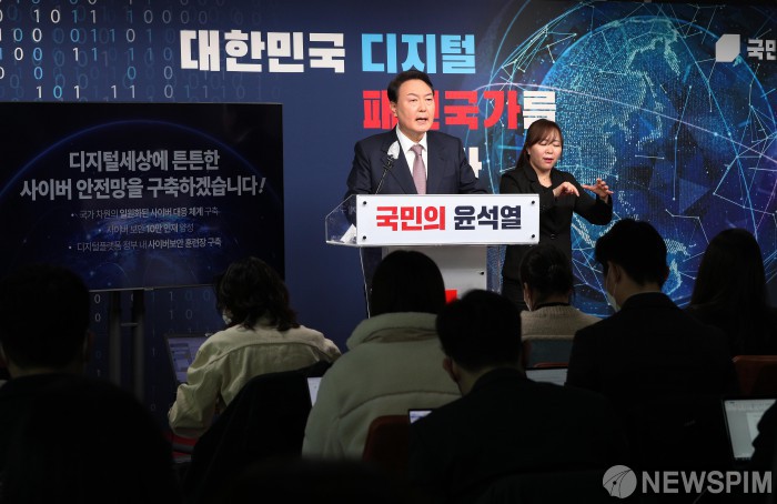 [서울=뉴스핌] 최상수 기자 = 윤석열 국민의힘 대선 후보가 28일 오전 서울 여의도 중앙당사에서 디지털 경제 정책과 관련한 공약을 발표하고 있다. 2022.01.28 kilroy023@newspim.com