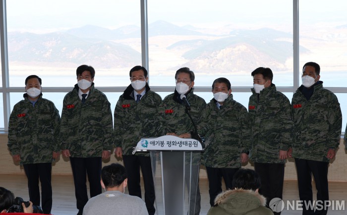 [김포=뉴스핌] 국회사진취재단 = 더불어민주당 이재명 대선후보가 28일 경기도 김포시 애기봉평화생태공원 해병대 2사단에서 해병대를 사실상 해군에서 독립시켜 육해공 '3군 체제'를 '준 4군 체제' 개편안을 발표하고 있다. 2022.01.28 photo@newspim.com