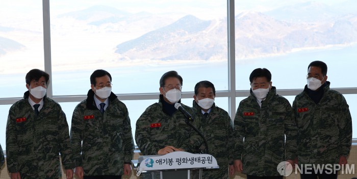 [김포=뉴스핌] 국회사진취재단 = 더불어민주당 이재명 대선후보가 28일 경기도 김포시 애기봉평화생태공원 해병대 2사단에서 해병대를 사실상 해군에서 독립시켜 육해공 '3군 체제'를 '준 4군 체제' 개편안을 발표하고 있다. 2022.01.28 photo@newspim.com