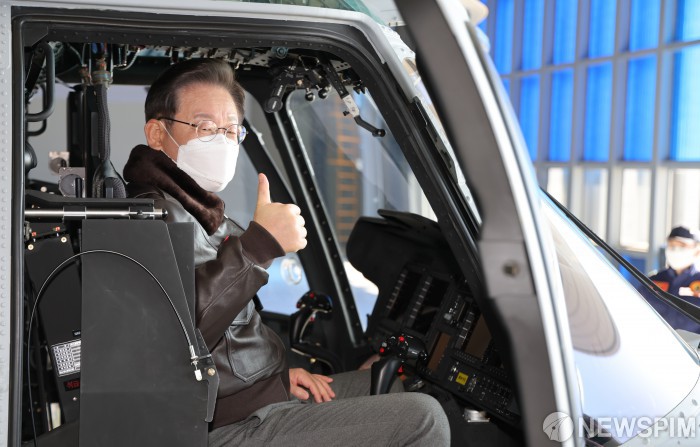 [김포=뉴스핌] 국회사진취재단 = 더불어민주당 이재명 대선후보가 28일 경기도 김포시 해병대 2사단 항공부대를 방문, 헬기에 타고 엄지손가락을 들어 보이고 있다. 2022.01.28 photo@newspim.com