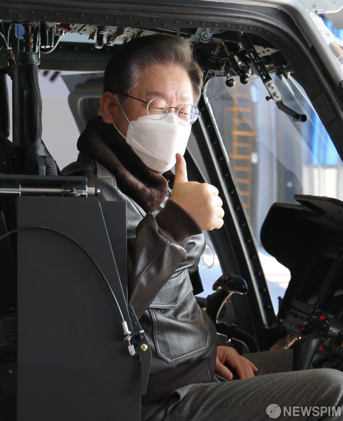 [김포=뉴스핌] 국회사진취재단 = 더불어민주당 이재명 대선후보가 28일 경기도 김포시 해병대 2사단 항공부대를 방문, 헬기에 타고 엄지손가락을 들어 보이고 있다. 2022.01.28 photo@newspim.com