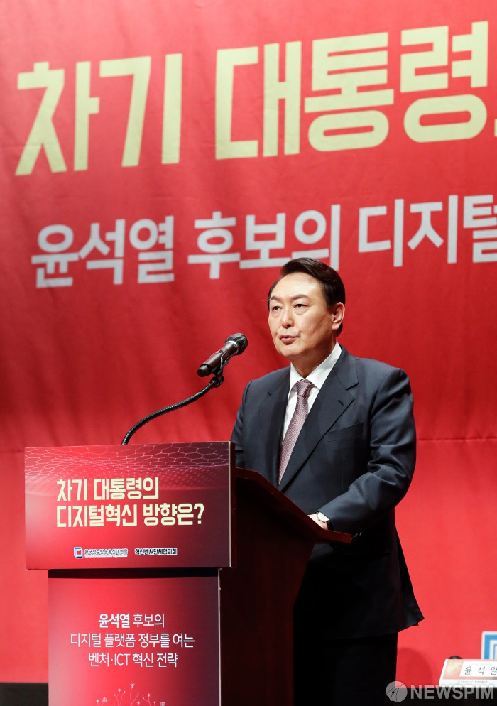 [서울=뉴스핌] 국회사진취재단 = 윤석열 국민의힘 대선후보가 28일 오후 서울 마포구 누리꿈스퀘어에서 열린 '차기 대통령의 디지털혁신 방향은?-벤처·ICT 혁신 전략 토론회'에 참석해 인사말하고 있다. 2022.01.28 photo@newspim.com