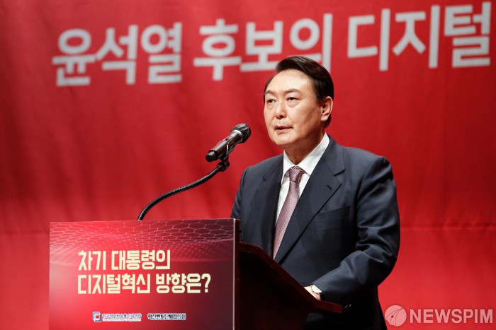 [서울=뉴스핌] 국회사진취재단 = 윤석열 국민의힘 대선후보가 28일 오후 서울 마포구 누리꿈스퀘어에서 열린 '차기 대통령의 디지털혁신 방향은?-벤처·ICT 혁신 전략 토론회'에 참석해 인사말하고 있다. 2022.01.28 photo@newspim.com