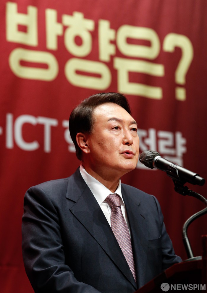 [서울=뉴스핌] 국회사진취재단 = 윤석열 국민의힘 대선후보가 28일 오후 서울 마포구 누리꿈스퀘어에서 열린 '차기 대통령의 디지털혁신 방향은?-벤처·ICT 혁신 전략 토론회'에 참석해 인사말하고 있다. 2022.01.28 photo@newspim.com