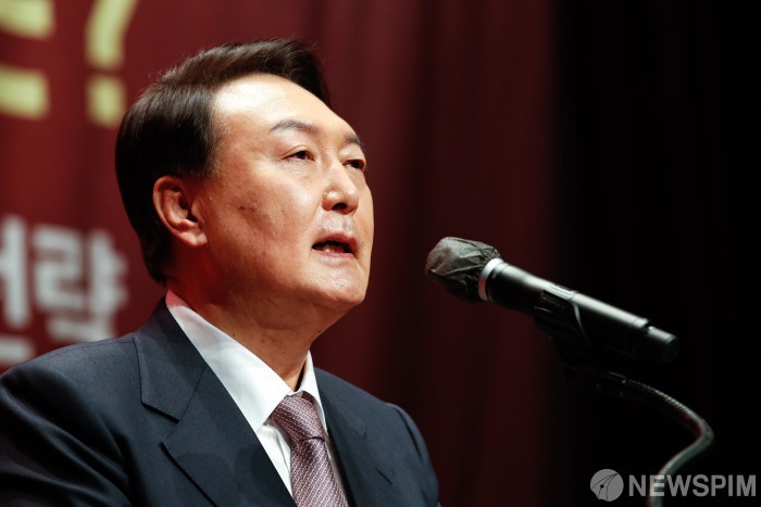 [서울=뉴스핌] 국회사진취재단 = 윤석열 국민의힘 대선후보가 28일 오후 서울 마포구 누리꿈스퀘어에서 열린 '차기 대통령의 디지털혁신 방향은?-벤처·ICT 혁신 전략 토론회'에 참석해 인사말하고 있다. 2022.01.28 photo@newspim.com