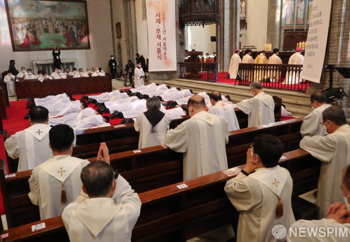 [서울=뉴스핌] 사진공동취재단 = 천주교서울대교구 사제, 부제 서품식이 열린 28일 오후 서울 중구 명동대성당에서 사제 서품후보자들이 부복(수품자들이 땅에 완전히 엎드려 기도하는 것)하고 있다. 2022.01.28 photo@newspim.com