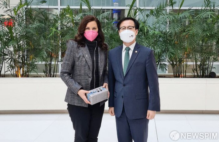 [서울=뉴스핌] 여한구 산업통상자원부 통상교섭본부장이 29일(현지시간) 미국 워싱턴 D.C 메리어트 마르퀴스호텔, 그레천 휘트머(Gretchen Whitmer) 미시간 주지사와 면담을 갖고 있다.[사진=산업통상자원부] 2022.01.30 photo@newspim.com