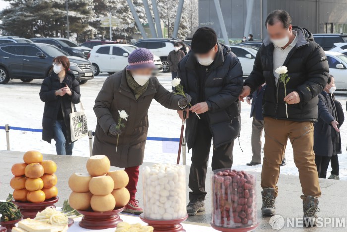 [파주=뉴스핌] 이형석 기자 = 설날을 맞이한 1일 오전 경기 파주 임진각 망배단에서 실향민 가족들이 차례를 지내고 있다. 2022.02.01 leehs@newspim.com