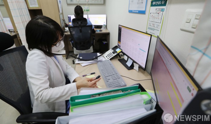 [서울=뉴스핌] 사진공동취재단 = 3일 강남구 역삼동 하나이비인후과병원 호흡기전담클리닉에서 의료진이 재택치료자들을 모니터링 하고 있다. 2022.02.03 photo@newspim.com