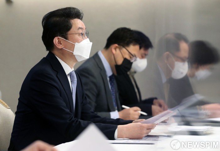 [서울=뉴스핌] 윤창빈 기자 = 이억원 기획재정부 제1차관이 4일 오전 서울 종로구 정부서울청사에서 열린 우크라이나 사태 비상대응 TF 회의에서 발언을 하고 있다. 2022.02.04 pangbin@newspim.com