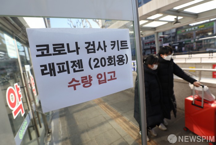 [서울=뉴스핌] 김민지 기자 = 품귀 현상이 일어났던 코로나19 자가검사키트가 6일부터 추가 공급된다. 식품의약품안전처에 따르면 오는 12일까지 약국과 온라인 쇼핑몰에 각각 508명분, 492만명분이 순차적으로 공급된다. 이번 공급은 지난달 29일 960만명분 이후 추가된 물량이다. 사진은 이날 오전 서울 시내 약국에 붙은 자가검사키트 입고 안내문. 2022.02.06 kimkim@newspim.com