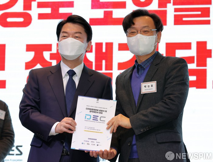 [서울=뉴스핌] 최상수 기자 = 국민의당 안철수 대선후보가 7일 오전 서울 글래드 여의도 호텔에서 열린 'G3 디지털경제 강국 도약을 위한 정책간담회'에 참석해 박성호 한국인터넷기업협회장으로부터 디지털경제연합 공약제안서를 전달받고 기념촬영하고있다. 2022.02.07 kilroy023@newspim.com
