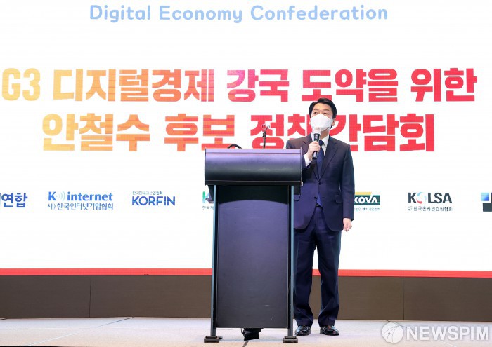 [서울=뉴스핌] 최상수 기자 = 국민의당 안철수 대선후보가 7일 오전 서울 글래드 여의도 호텔에서 열린 ‘G3 디지털경제 강국 도약을 위한 정책간담회’에 참석해 인사말을 하고 있다. 2022.02.07 kilroy023@newspim.com