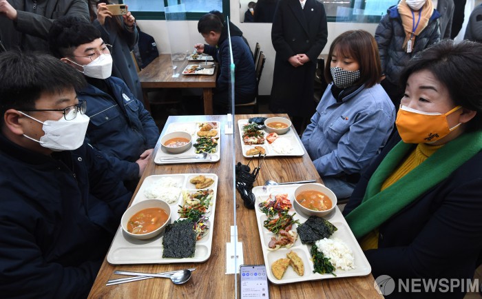 [안산=뉴스핌] 국회사진취재단 = 심상정 정의당 대선후보가 8일 오후 경기도 안산시 단원구 유성식당에서 시화공단 작은공장 노동자들을 만나 식사하며 대화하고 있다. 2022.02.08 photo@newspim.com
