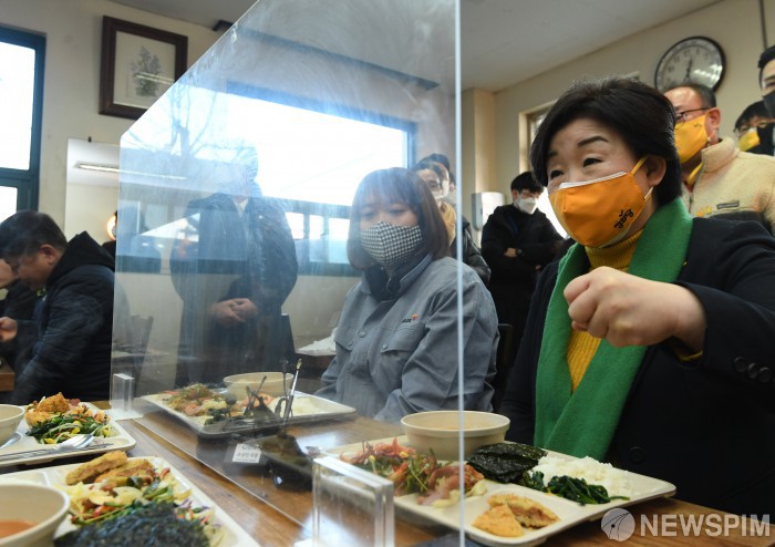 [안산=뉴스핌] 국회사진취재단 = 심상정 정의당 대선후보가 8일 오후 경기도 안산시 단원구 유성식당에서 시화공단 작은공장 노동자들을 만나 식사하며 대화하고 있다. 2022.02.08 photo@newspim.com