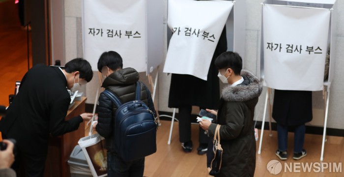 [성남=뉴스핌] 정일구 기자 = 9일 오전 경기 성남시 카카오 판교오피스에 마련된 자가검사부스에서 카카오 직원들이 코로나19 자가진단키트 검사를 하고 있다. 2022.02.09 mironj19@newspim.com