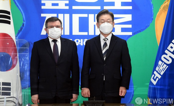 [서울=뉴스핌] 최상수 기자 = 이재명 더불어민주당 대선후보가 9일 서울 여의도 중앙당사에서 안드레이 쿨릭 주한러시아 대사와 기념촬영을 하고 있다. 2022.02.09 kilroy023@newspim.com