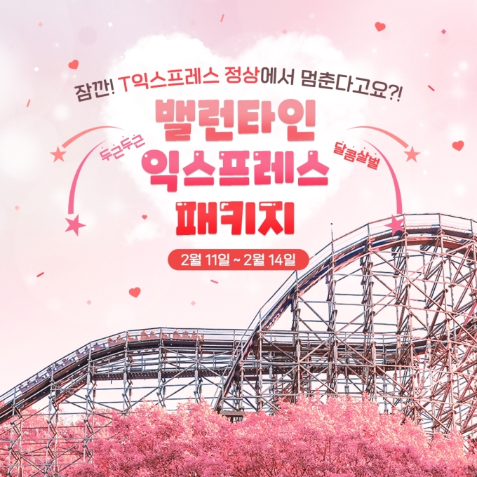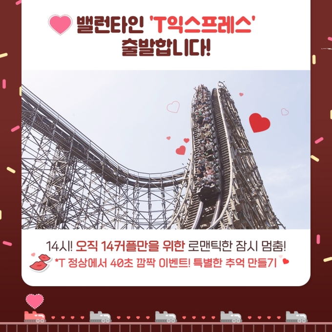 우선 '밸런타인 익스프레스'는 11일부터 겨울잠을 깨고 재가동에 들어가는 티익스프레스를 타고 하이라이트인 77도 각도의 하강 구간을 지나 지상 30m 높이에서 약 1분간 멈춰 특별한 사랑 고백 타임을 갖는다.