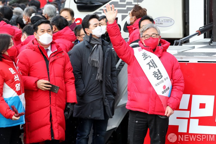 [서울=뉴스핌] 국회사진취재단 = 국민의힘 종로보궐 후보자 최재형 전 감사원장이 제20대 대통령 선거 공식 선거운동이 시작된 15일 오전 서울 중구 청계광장에서 열린 ‘국민이 키운 윤석열’ 출정식에서 손인사를 하고 있다. 2022.02.15 photo@newspim.com
