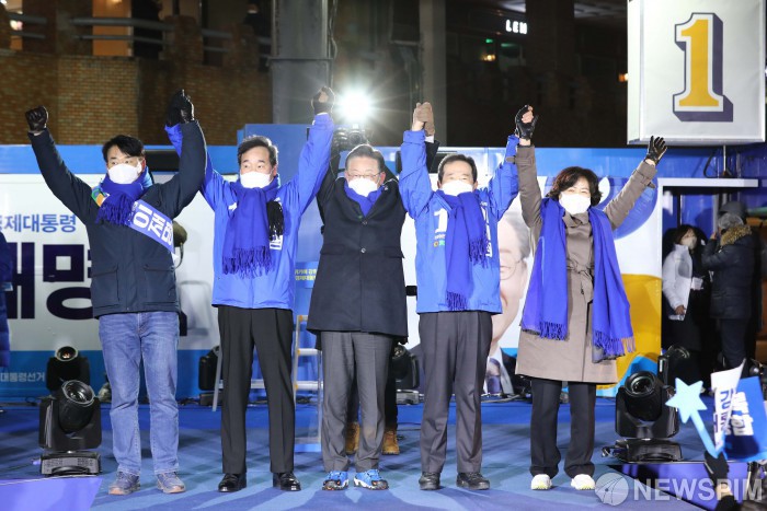[서울=뉴스핌] 국회사진취재단 = 이재명 더불어민주당 대선 후보(가운데)가 공식 선거운동 개시일인 15일 오후 서울 서초구 고속터미널역 앞에서 열린 첫 집중 유세에서 이낙연 총괄선대위원장, 정세균 상임고문 등과 함께 시민들에게 두 팔을 들어 인사하고 있다. 2022.02.15 photo@newspim.com