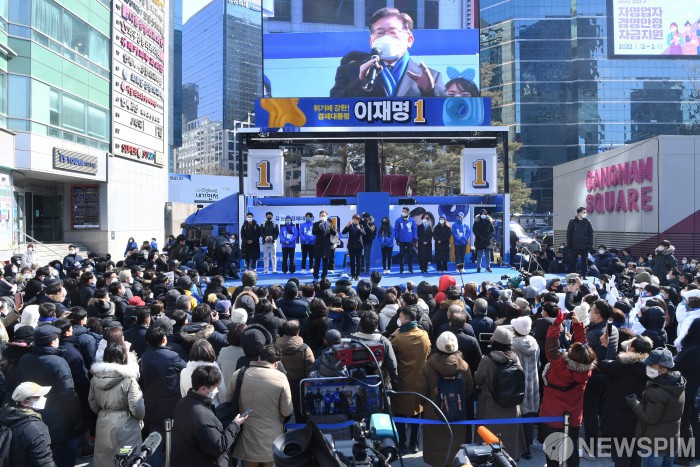 [서울=뉴스핌] 최상수 기자 = 이재명 더불어민주당 대선 후보가 16일 서울 강남구 강남역 인근에서 열린 JM은 강남스타일! 선거 유세에서 지지를 호소하고 있다. 2022.02.16 kilroy023@newspim.com