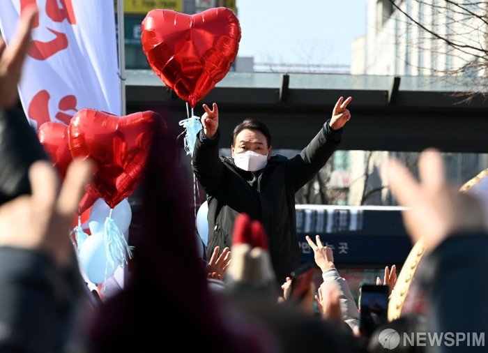 [성남=뉴스핌] 국회사진취재단 = 윤석열 국민의힘 대선후보가 17일 경기 성남시 분당구 야탑역 1번 출구에서 열린 "부패 없는 성남! 공정한 대한민국!" 성남 유세를 마치고 지지자들과 인사하고 있다. 2022.02.17 photo@newspim.com