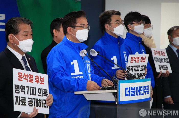 [서울=뉴스핌] 윤창빈 기자 = 이용빈 더불어민주당 의원이 20일 서울 여의도 더불어민주당 중앙당사에서 열린 '국민의힘 윤석열 후보 부동시 병역기피' 관련 기자회견에서 발언하고 있다. 2022.02.20 pangbin@newspim.com