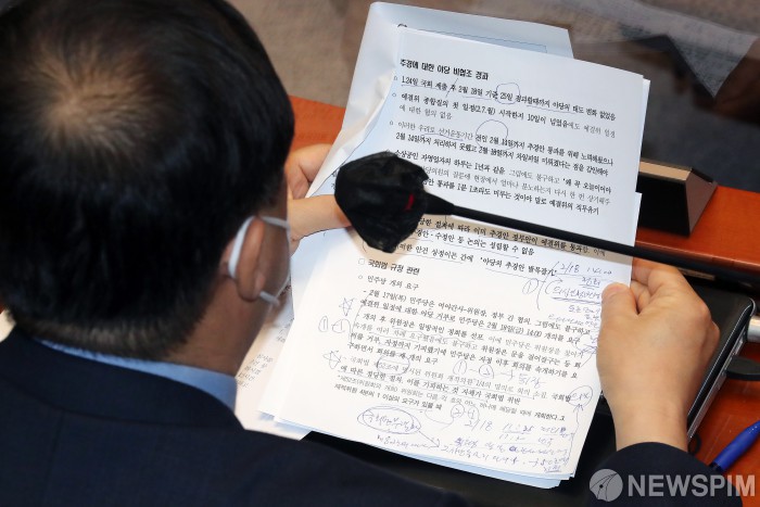 [서울=뉴스핌] 이형석 기자 = 맹성규 더불어민주당 예결위 간사가 20일 서울 여의도 국회에서 열린 예산결산특별위원회 전체회의에서 추경에 대한 야당의 비협조 경과를 보고하고 있다. 2022.02.20 leehs@newspim.com