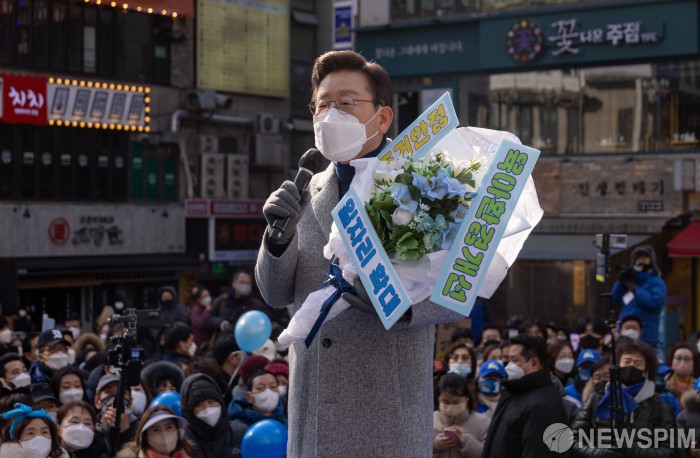 [인천=뉴스핌] 국회사진취재단 = 이재명 더불어민주당 대선 후보가 22일 오후 인천 로데오거리 광장유세에서 청년들의 공약 부케를 받고 발언하고 있다. 2022.02.22 photo@newspim.com