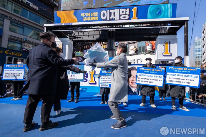[인천=뉴스핌] 국회사진취재단 = 이재명 더불어민주당 대선 후보가 22일 오후 인천 로데오거리 광장유세에서 청년들의 공약 부케를 받고 있다. 2022.02.22 photo@newspim.com