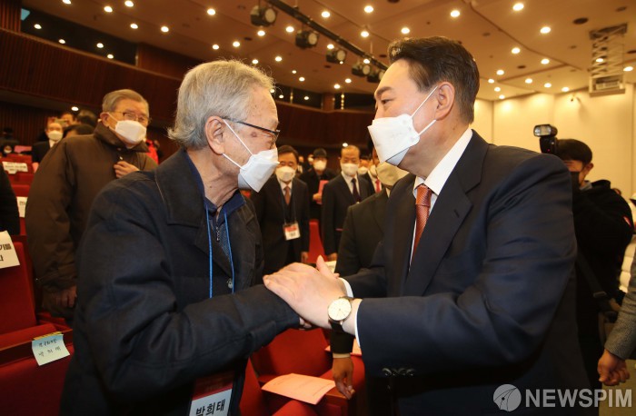 [서울=뉴스핌] 최상수 기자 = 윤석열 국민의힘 대선 후보가 24일 서울 여의도 국회도서관에서 열린 ‘전직 여야 국회의장‧의원 윤석열 후보 지지 결의’ 행사에서 박희태 전 국회의장과 악수하고 있다. 2022.02.24 kilroy023@newspim.com