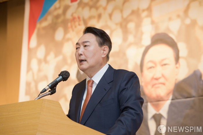 [서울=뉴스핌] 최상수 기자 = 24일 오전 서울 여의도 국회도서관 대강당에서 열린 여야 전직 국회의장. 국회의원들이 윤석열 후보 지지선언에 참석한 윤석열 대선후보가 인사말을 하고 있다. 2022.02.24 kilroy023@newspim.com