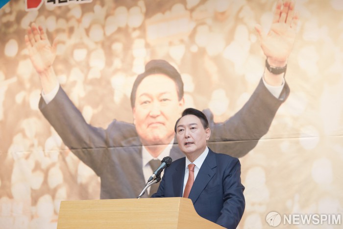 [서울=뉴스핌] 최상수 기자 = 24일 오전 서울 여의도 국회도서관 대강당에서 열린 여야 전직 국회의장. 국회의원들이 윤석열 후보 지지선언에 참석한 윤석열 대선후보가 인사말을 하고 있다. 2022.02.24 kilroy023@newspim.com